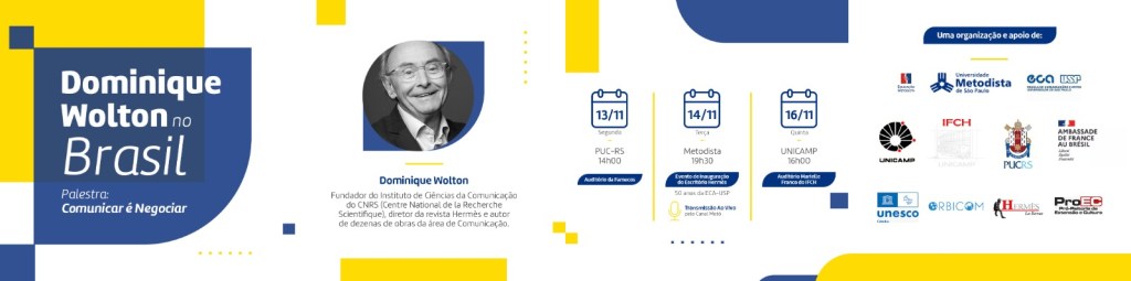 O renomado autor e diretor da revista francesa Hermès la Revue, Dominique Wolton, estará presente em três cidades brasileiras no mês de novembro de 2023. O autor visitará Porto Alegre, São Bernado do Campo e Campinas. No dia 16 de novembro, o Prof. Wolton estará ministrando a palestra “Comunicar é Negociar”, que também é título de seu mais recente livro, já traduzido em português.