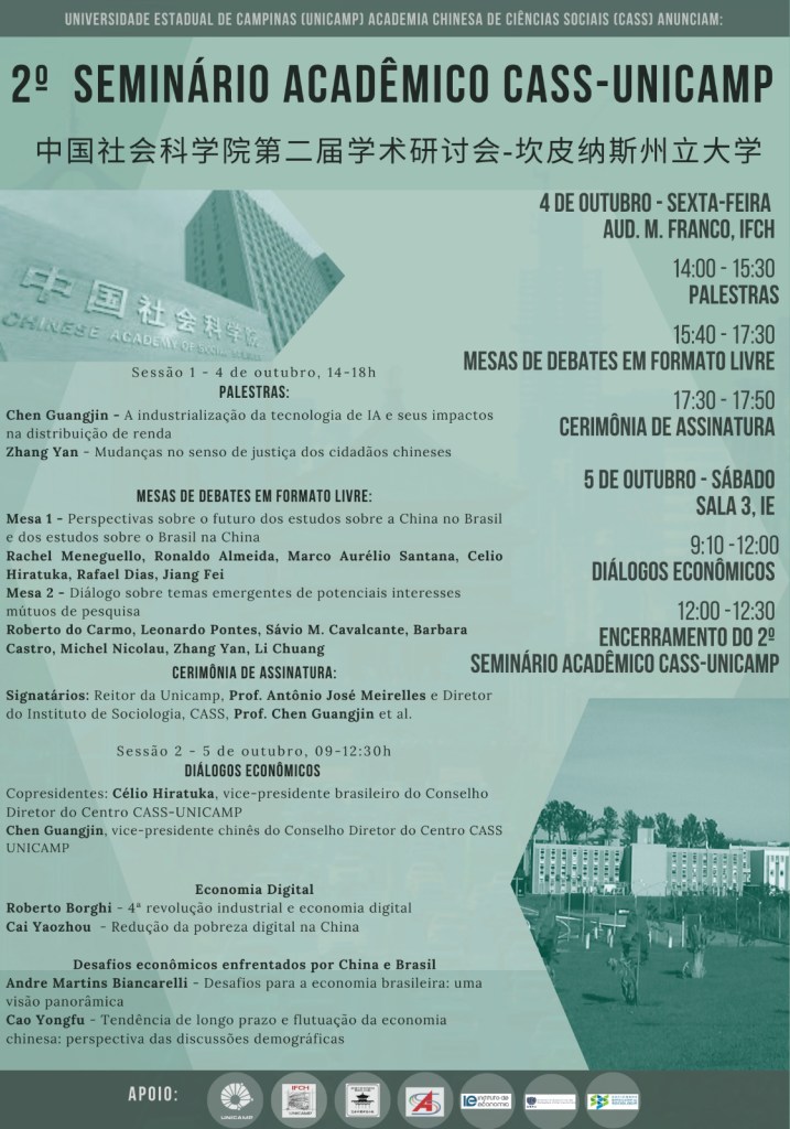 O seminário será realizado na UNICAMP, nos Institutos de Filosofia e Ciências Humanas (IFCH) e de Economia (IE) e contará com a presença dos Professores Li Chunling e Chen Guangjing, Diretora Chinesa do CASS-UNICAMP e Conselheiro do CASS-UNICAMP Centro de Estudos Sobre a China, respectivamente.